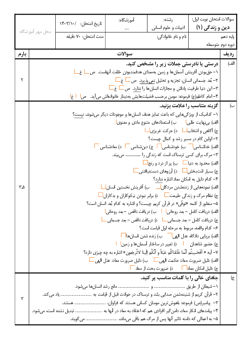 نمونه‌سوال دینی دهم انسانی نوبت اول با پاسخنامه