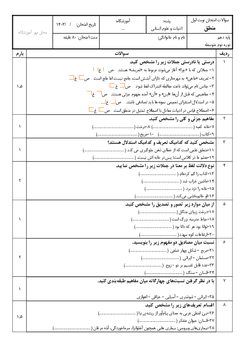 نمونه‌سوال منطق دهم نوبت اول با پاسخنامه