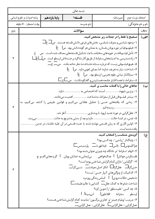 نمونهسوال فلسفه یازدهم نوبت دوم با پاسخنامه
